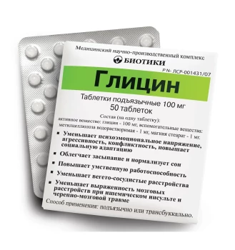 Глицин является регулятором обмена веществ, нормализует и активирует процессы защитного торможения в ЦНС, уменьшает психоэмоциональное напряжение, повышает умственную работоспособность. Глицин обладает глицин- и ГАМКергическим, α1-адреноблокирующим, антиоксидантным, антитоксическим действием; регулирует деятельность глутаматных (NMDA) рецепторов, за счет чего препарат способен: